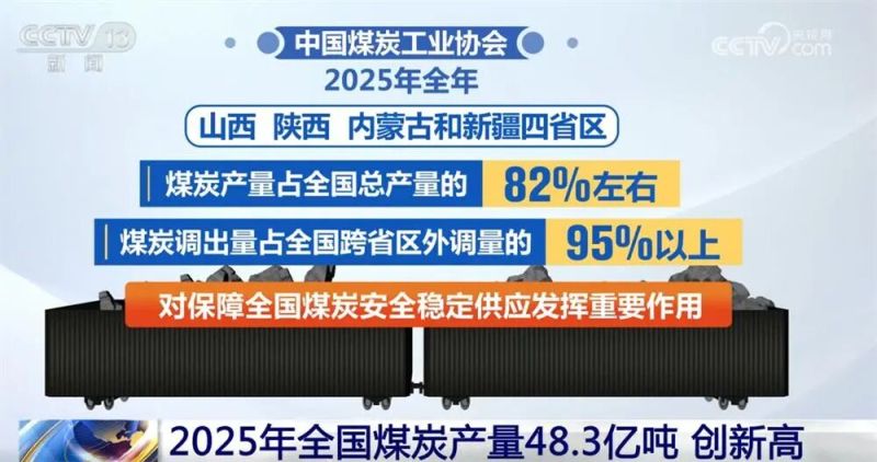 作为能源保供“压舱石”,煤炭供应在生产端依托政策引导与产能释放实现稳定输出,2025年全年全国规模以上煤炭产量创历史新高;山西、陕西、内蒙古和新疆四省区煤炭产量占全国总产量的82%左右,四省区煤炭调出量占全国跨省区外调量的95%以上,对保障全国煤炭安全稳定供应发挥了重要作用。